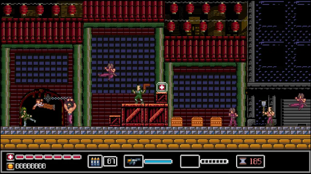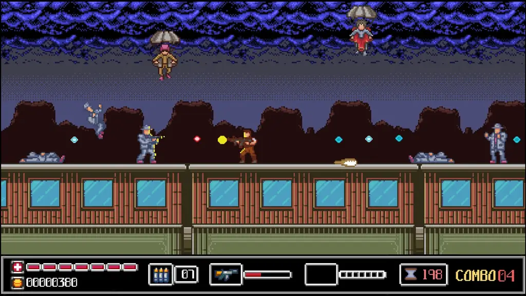 Ретро-стилистика с классическим 8-битным визуалом создает выразительную атмосферу 1964-го, где каждый экран выглядит как найденная кассета с забытым аркадным хитом. Такая подача не просто работает на ностальгию, но и делает бой читаемым, чтобы игрок быстрее оценивал угрозы и не терял ритм.