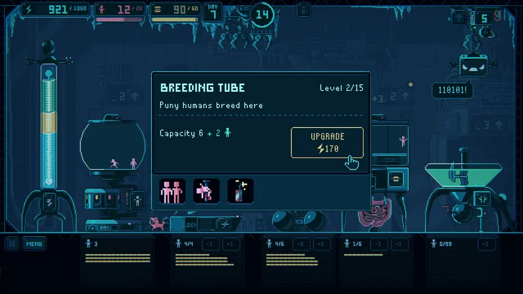 В этой циничной инди-стратегии с элементами рогалика геймплей грамотно выстроен вокруг микроконтроля ресурсов. Игроку необходимо непрерывно следить за показателями усталости и голода человеческой биомассы. Такой подход гарантирует, что конвейер не остановится ни на секунду, но при этом заставляет принимать максимально быстрые тактические решения. Если же кто-то из работников окончательно выбьется из сил, его всегда можно выгодно утилизировать, отправив прямиком в биореактор для получения дополнительных мощностей.