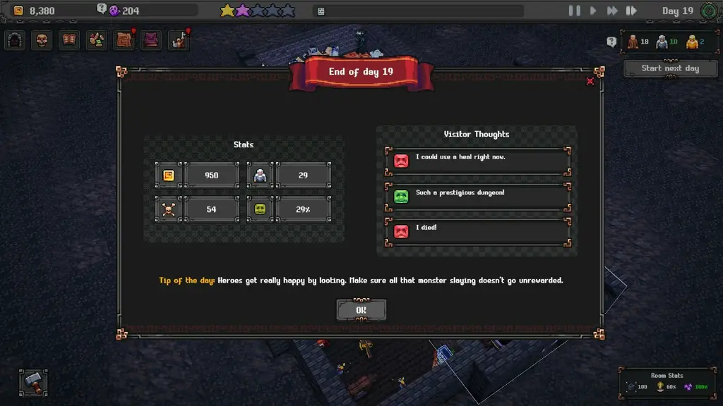 У проекта сильная бизнес-составляющая: подземелье здесь — не просто логово, а полноценное предприятие. Нужно развивать темный бизнес, улучшать помещения предметами, продумывать лабиринты с обманчивыми возможностями и зарабатывать на каждом походе героев. Дополнительную глубину дает продажа зелий и других вспомогательных товаров, что превращает обычный менеджмент в прибыльную систему с множеством решений.
